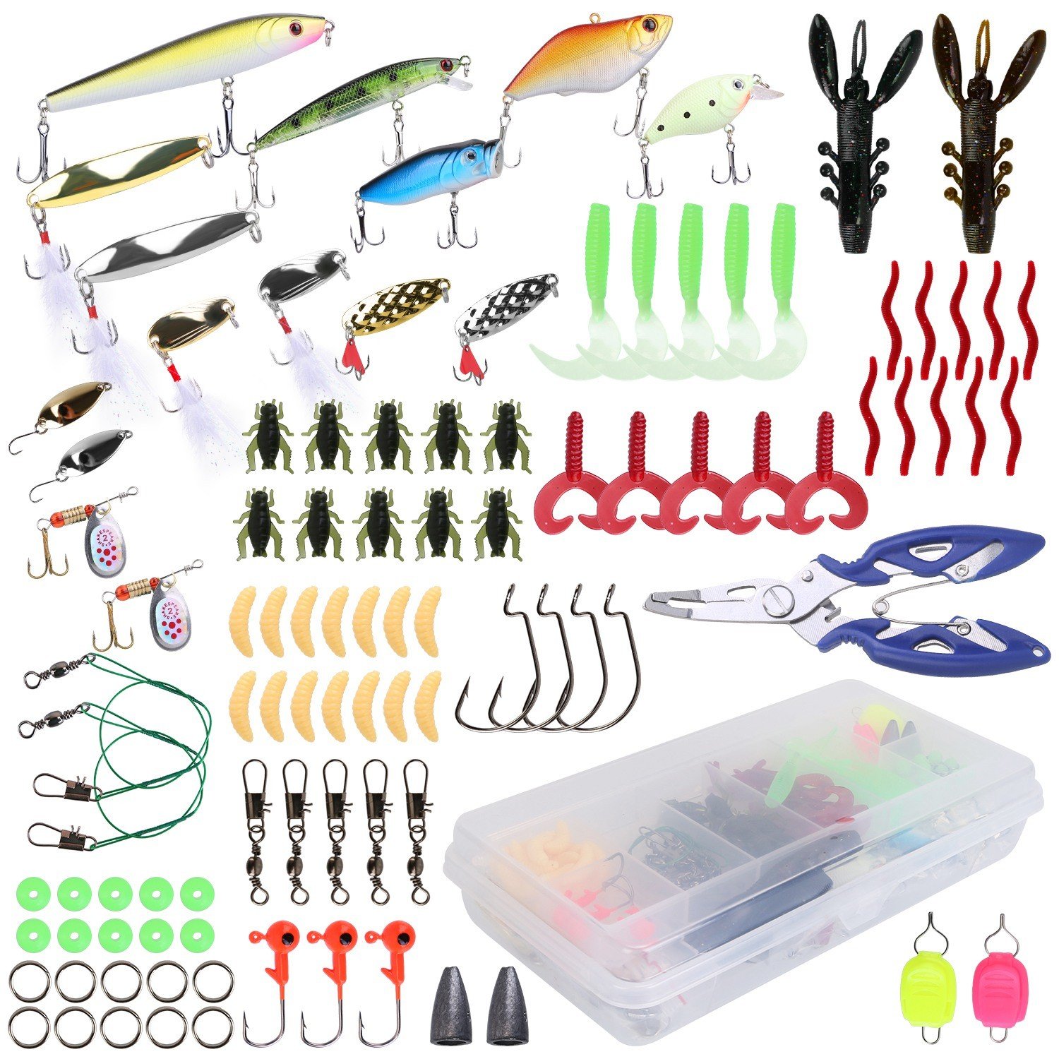 *101Pcs Complete Fishing Kits*:Come with total 101pcs fishing lures set including 46pcs soft lures(shrimps; earthworms; crickets; etc.); 15Pcs hard fish hooks(crankbaits and spoon fishing lures) and 38pcs accessories(jig hooks; fishing snaps; double-loops; drop shot weight; etc.); 1 plier and a storage box; which can meet your various fishing ideas!