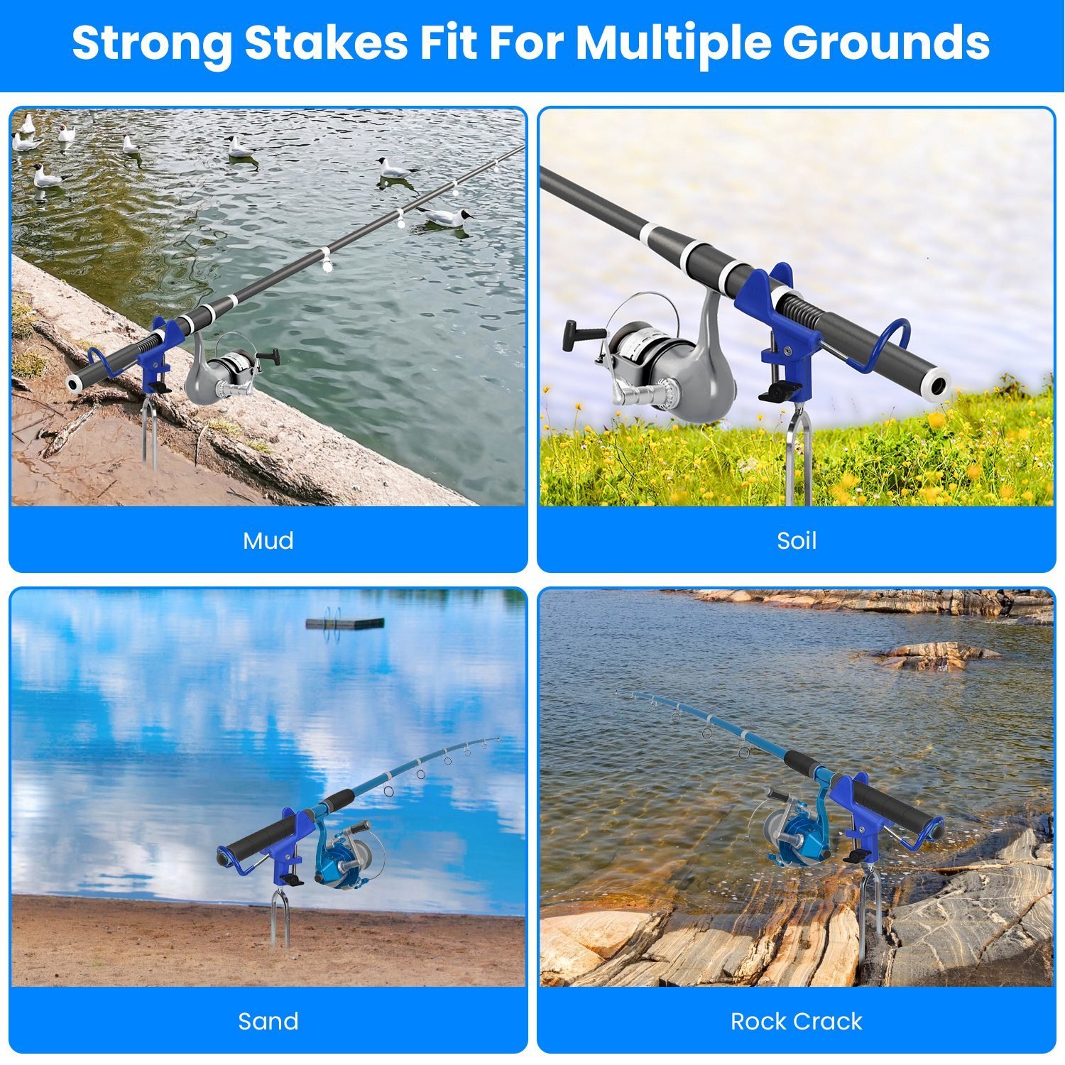 *Rustproof Stainless Steel Stake*:Made of premium stainless steel,rustproof,high-strength,sturdy and durable,the strong and sharp stake can deeply insert into mud,sand,soil,rock cracks or other grounds,ensuring steadily and securely standing. Additionally,the rubber cap can be used to cover the sharp end to prevent accidently damage to your fishing equipment.