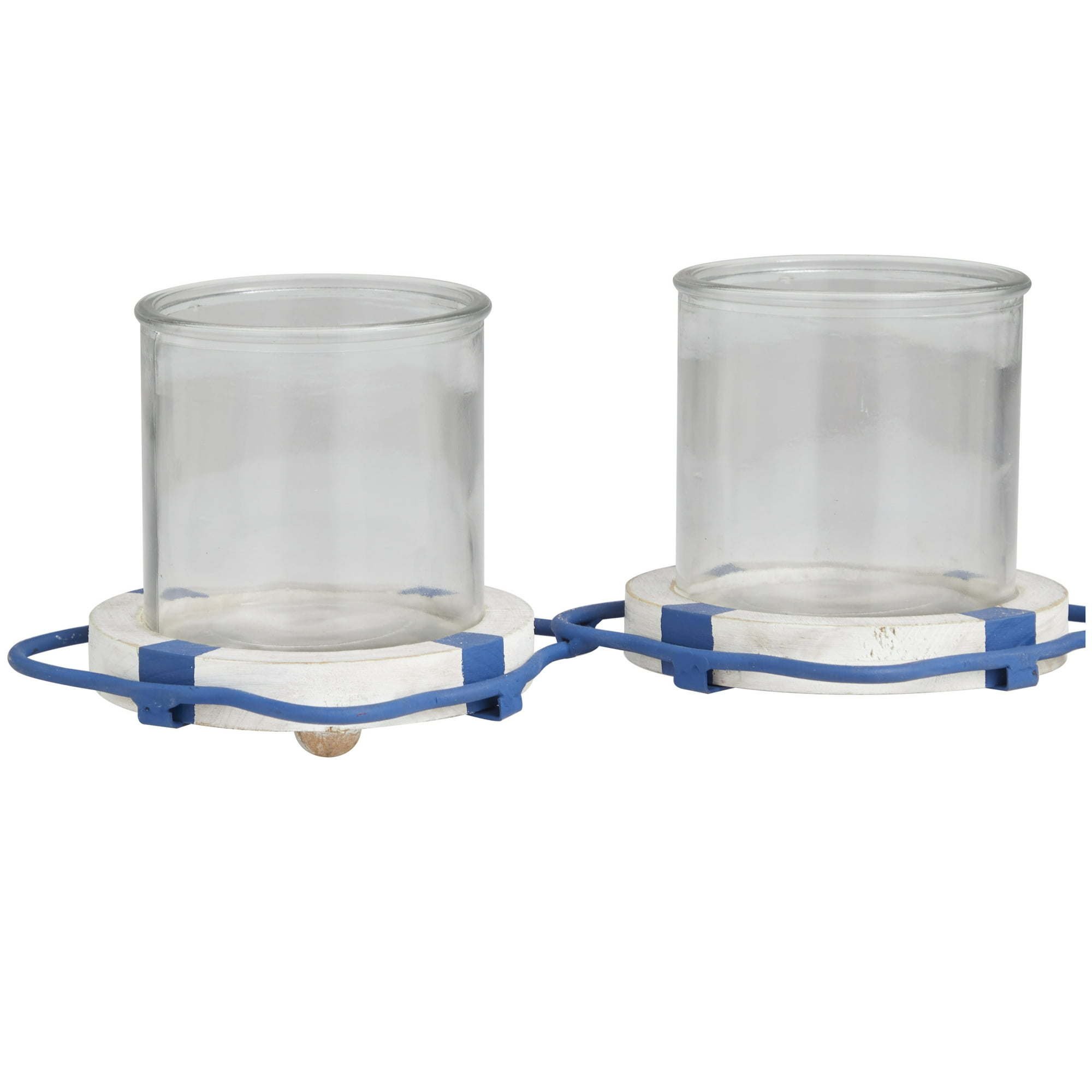 Coastal candle set highlights a distressed white wood finish with matte blue iron detailing and clear glass holders