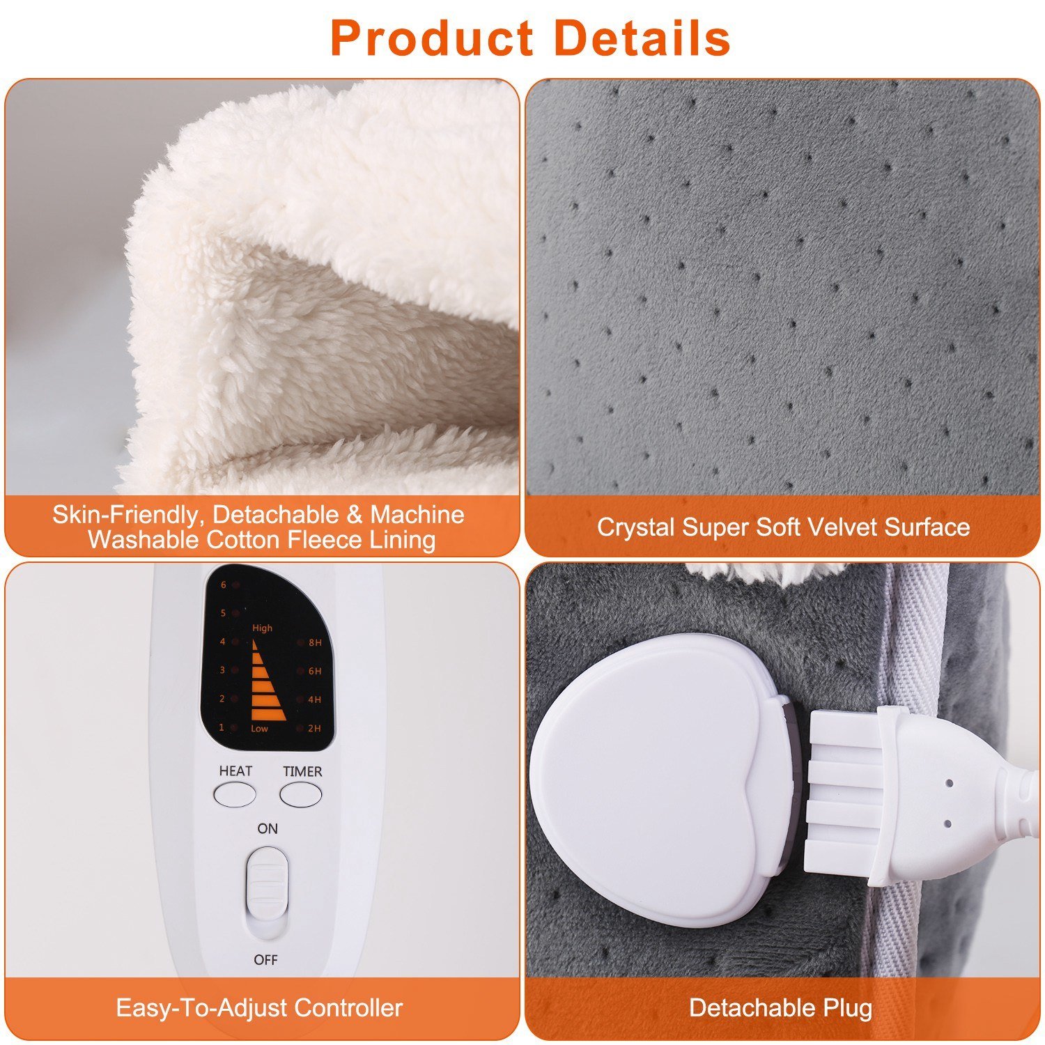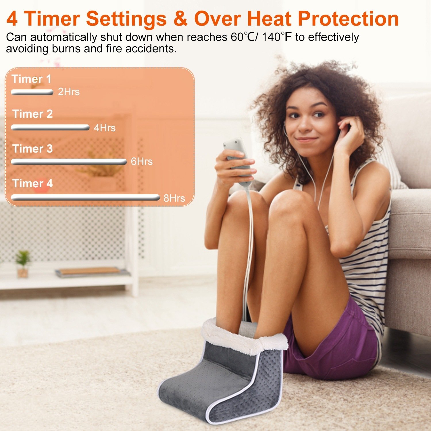 *4 Timer Settings*:There are 4 time settings on the controller; you can adjust 2/4/6/8hrs timer according to your needs. Overheat protection function makes it intelligently sense the temperature and automatically shut down when it reaches 60℃/ 140℉ to effectively avoiding burns and fire accidents. You can turn it off then turn on to use it again.
