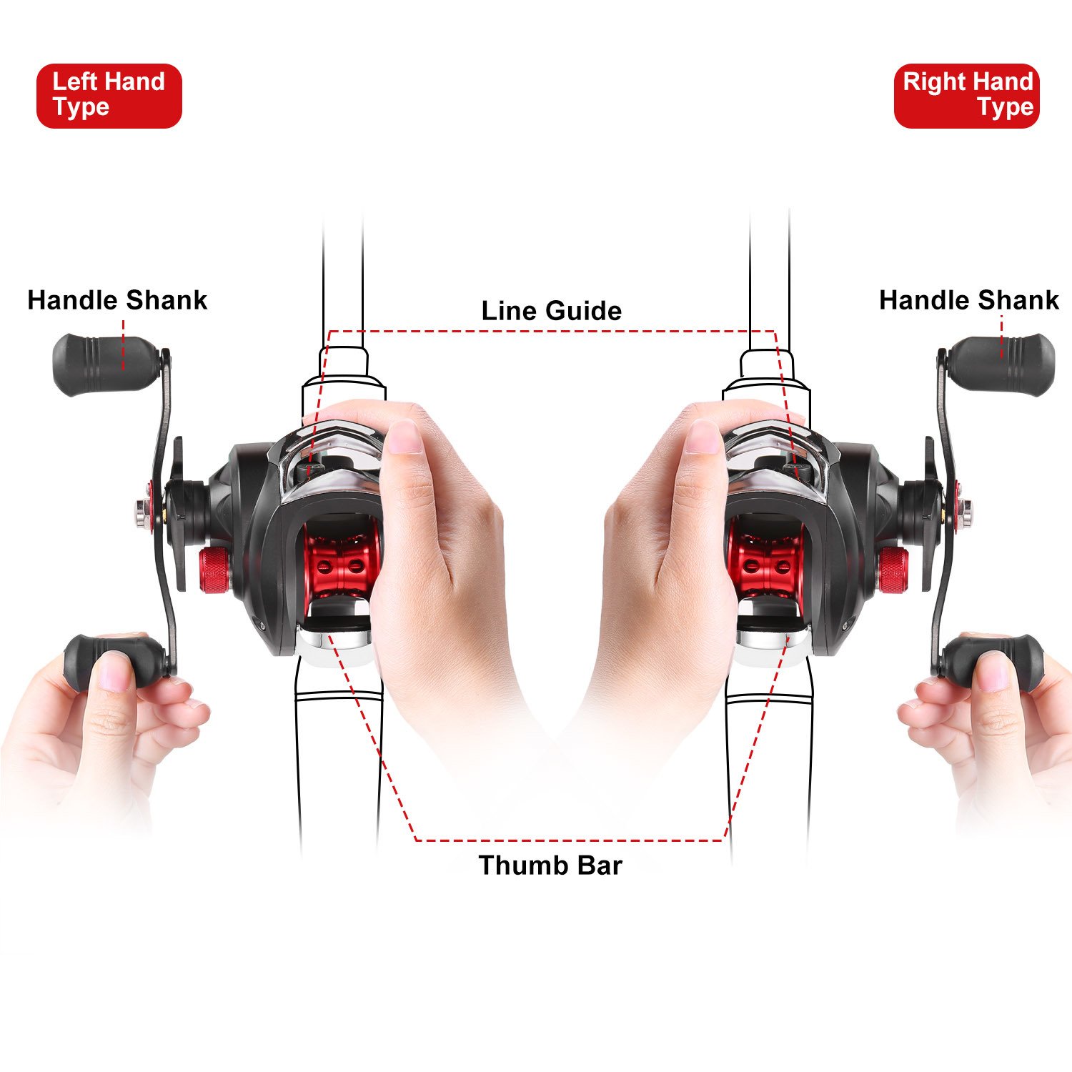 *RELIABLE AND LIGHTWEIGHT EXTERIOR DESIGN*:Featuring a thumb bar to cast the line sensitively,a smooth U-shaped aluminum alloy spool to contain more lines and two recessed plastic handles for a smooth and comfortable rotation. Besides,coming with only .48lbs-weight,it is light enough to reduce hand fatigue when fishing.