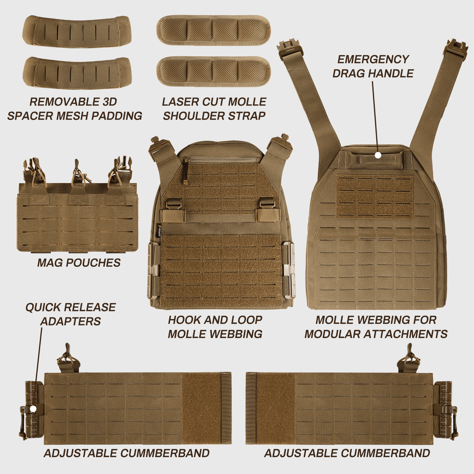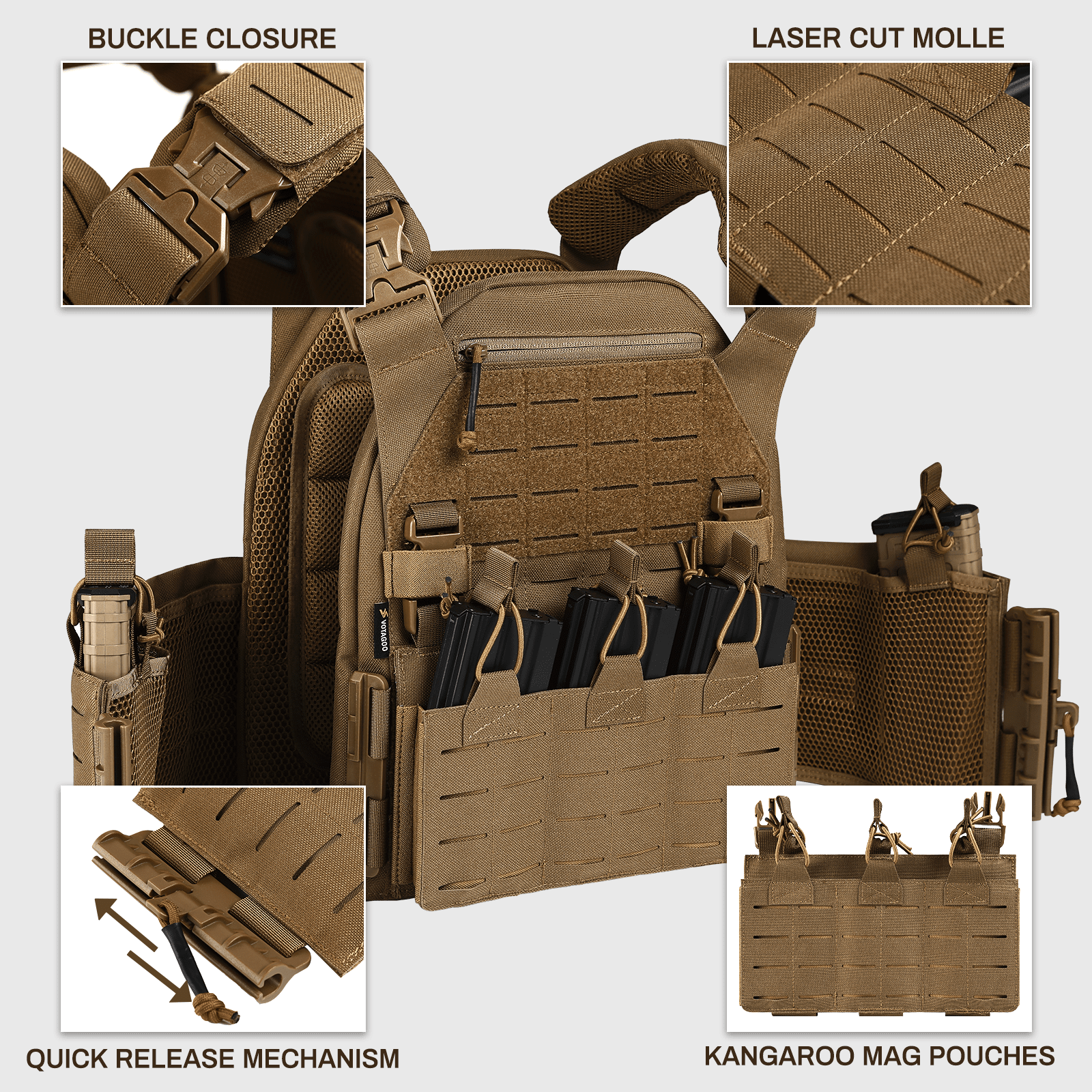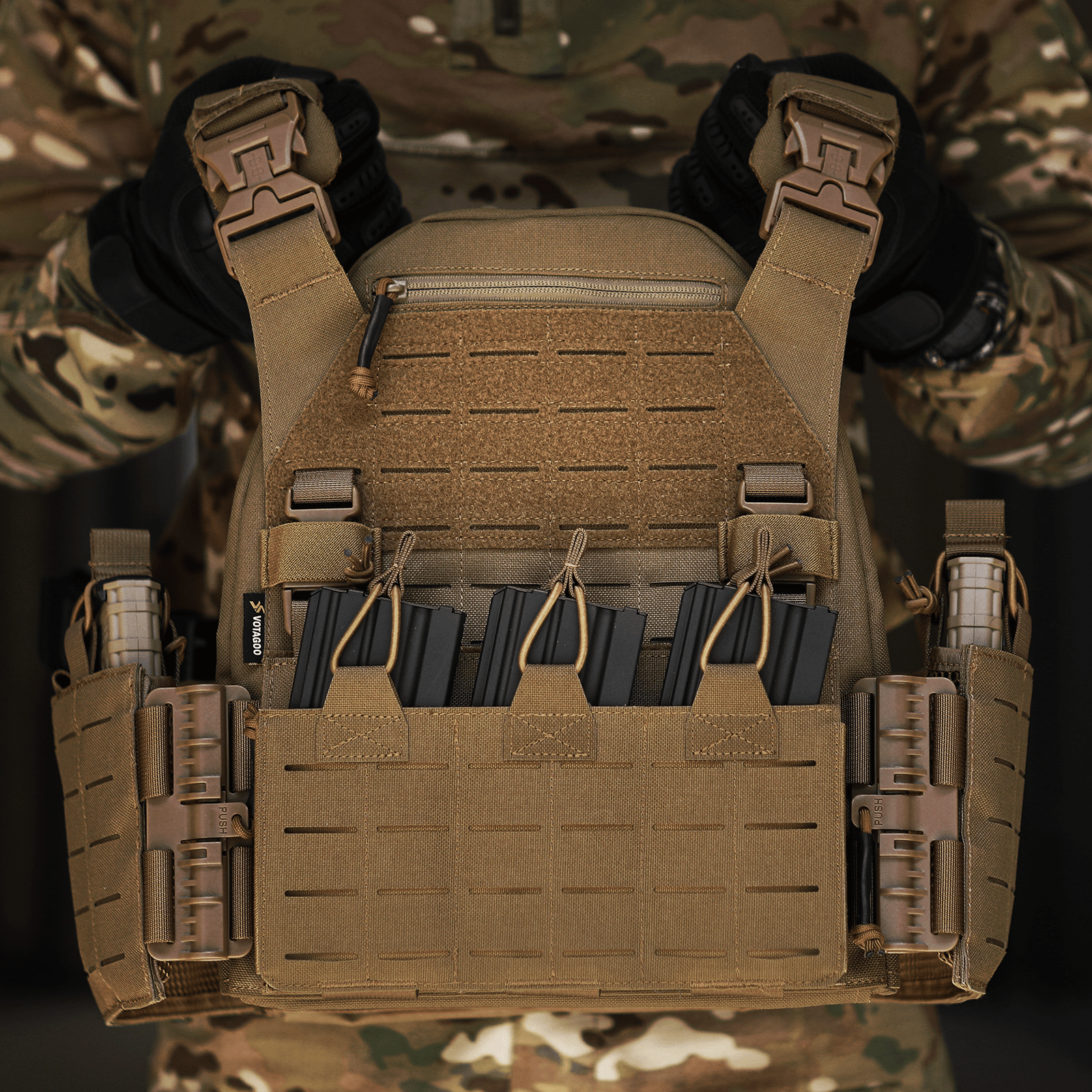 High-Strength & Wear-Resistant Material: The VOTAGOO tactical vest is made of 1000D nylon, an heavy duty fabric that resists wear, stress, and tearing. Designed to perform in diverse combat environments, our water-repellent fabric ensures minimal water absorption, making it suitable for all weather conditions.